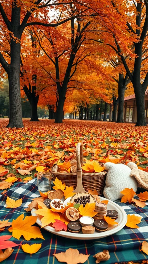 In this picture, you can see a picnic setup that captures the essence of fall. A wicker basket filled with freshly baked cookies and some green apples sits nearby. The picnic spread features a mix of seasonal treats, including pumpkin-themed snacks and colorful leaves that add a touch of nature to the feast.