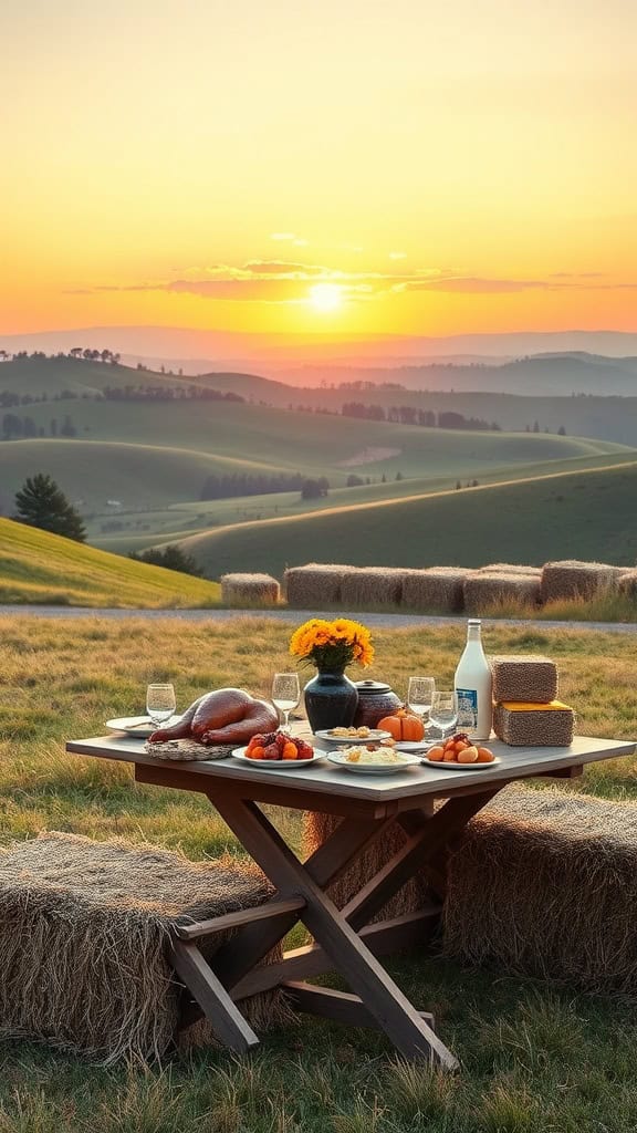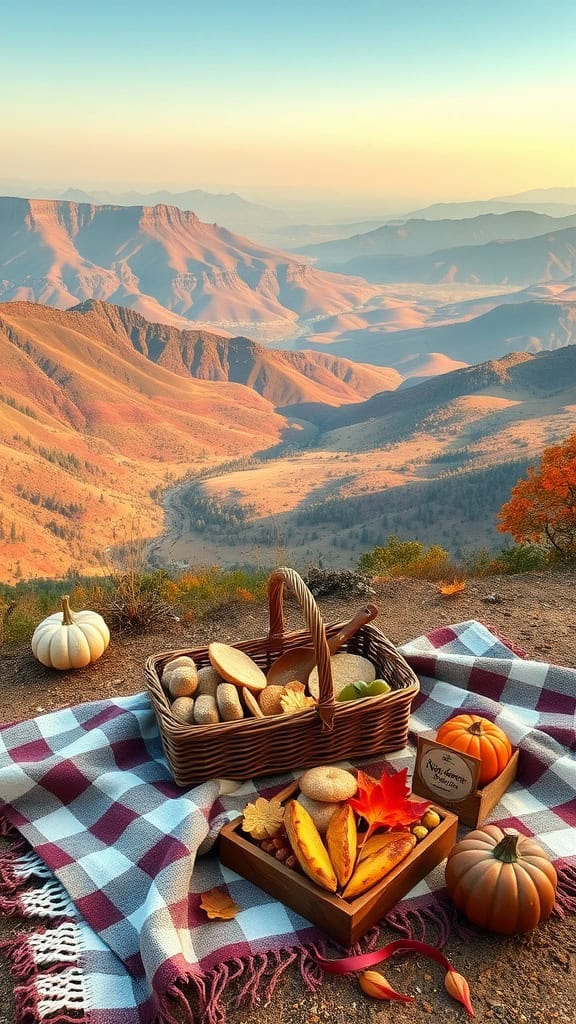 Imagine spreading a cozy blanket at a scenic overlook, surrounded by breathtaking views of rolling hills and vibrant autumn colors. The sun is setting, casting a warm glow over the landscape, creating the perfect backdrop for a Thanksgiving picnic.