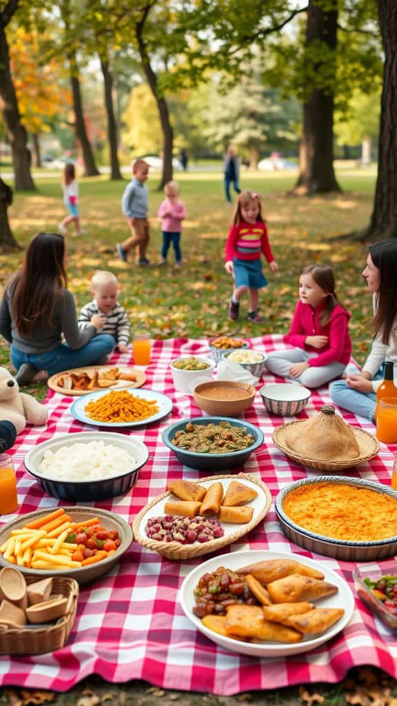When planning a Thanksgiving picnic, a family-friendly park can be a wonderful spot to gather with loved ones. The image showcases a joyful scene of families enjoying a picnic on a checkered blanket, surrounded by trees that reflect the warm hues of fall.