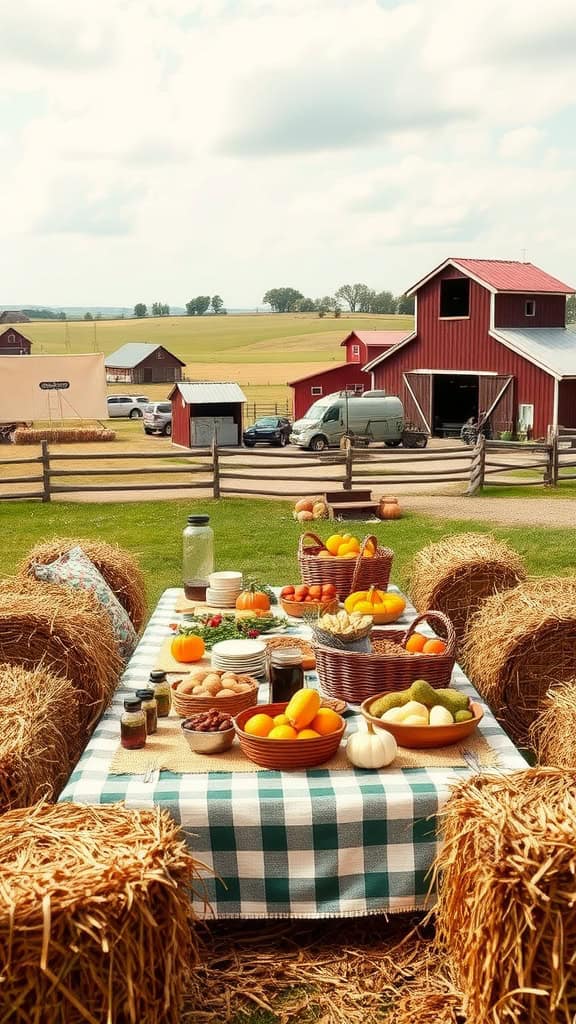Imagine a cozy picnic spread out on a checkered tablecloth, surrounded by the charm of a farmstead. A table filled with colorful fruits, crunchy snacks, and seasonal decorations sets a delightful scene. The backdrop features classic red barns and sprawling green fields, inviting you to enjoy nature’s beauty.