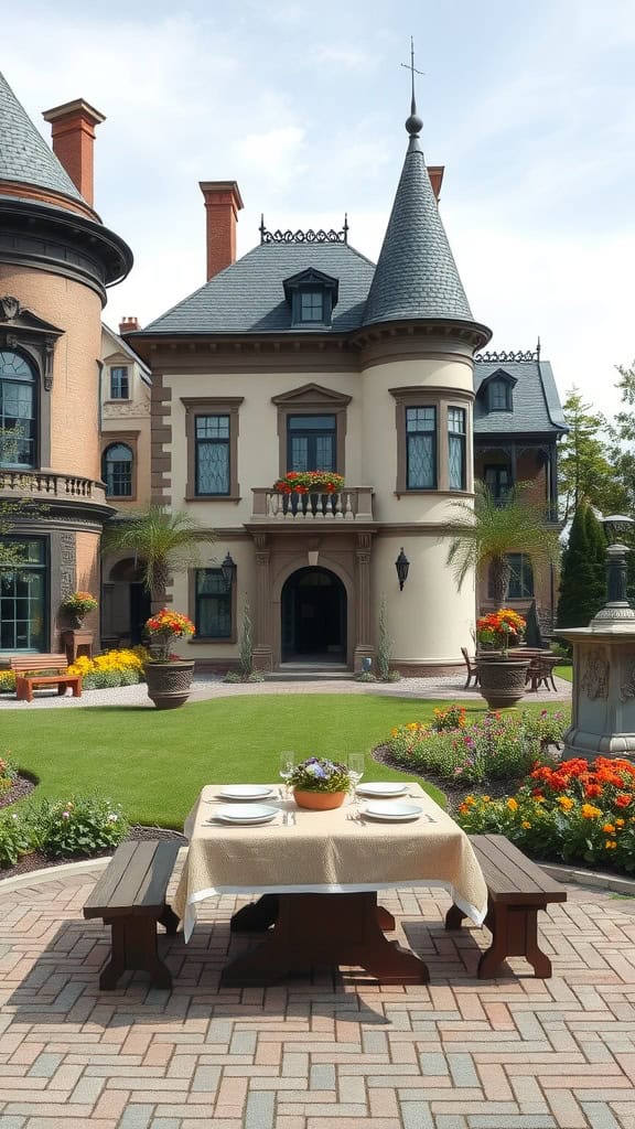 Imagine hosting your Thanksgiving picnic at a historic site, surrounded by beautiful architecture and lush gardens. The image captures a charming outdoor space with a lovely table set up, ready for a delightful meal. The backdrop features a grand building that hints at stories from the past, making it a perfect spot for family gatherings.