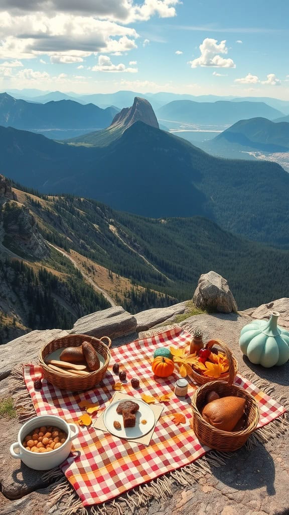 The picnic table, adorned with a cozy checkered blanket, showcases a delicious spread of food. You can see a variety of seasonal treats, including pumpkin dishes and crunchy snacks. It’s all about enjoying good food with good company while surrounded by stunning views.