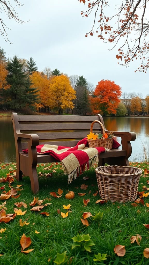 Picture a cozy bench by a serene pond, surrounded by the vibrant colors of autumn. The golden and red leaves create a picturesque backdrop, making it an ideal setting for a Thanksgiving picnic. This peaceful spot invites you to relax and enjoy the beauty of nature.