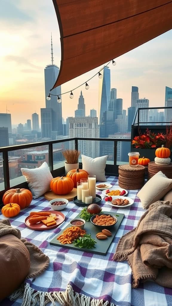 Imagine having your Thanksgiving picnic high above the bustling city. An urban rooftop offers a unique blend of nature and city vibes. The skyline provides a stunning backdrop as the sun sets, creating a cozy atmosphere.