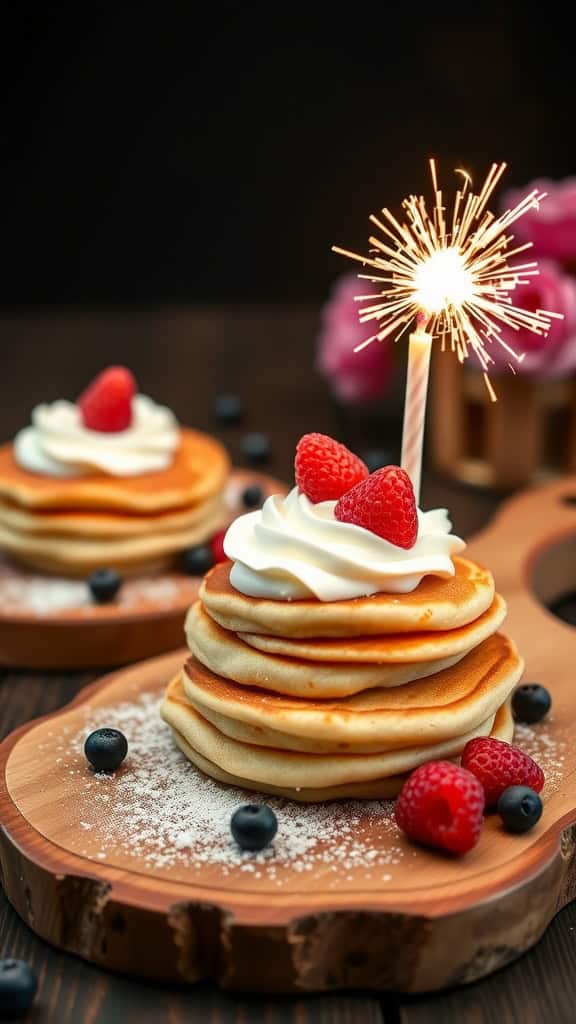 The image shows a stack of golden pancakes adorned with raspberries and blueberries, making it visually appealing. The sparkler on top adds a fun, festive touch. It’s a playful way to serve breakfast or dessert at a birthday celebration.