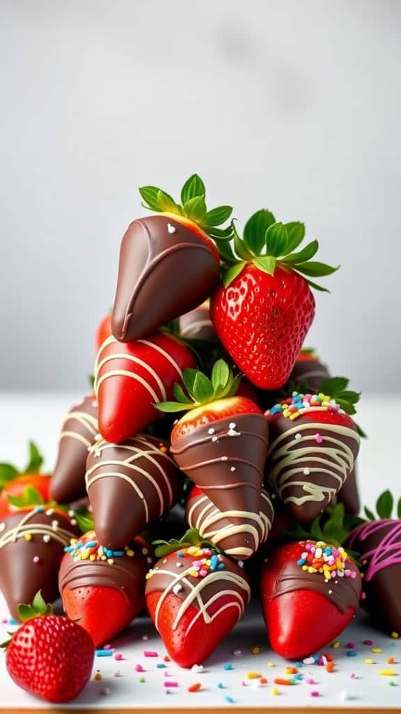 To create this lovely tower, you’ll need fresh strawberries, milk or dark chocolate, and some colorful sprinkles for that extra flair. Start by melting your chocolate in a microwave or double boiler. Dip each strawberry in the melted chocolate, letting the excess drip off, and then place it on a tray lined with parchment paper. While the chocolate is still warm, add sprinkles for a pop of color.