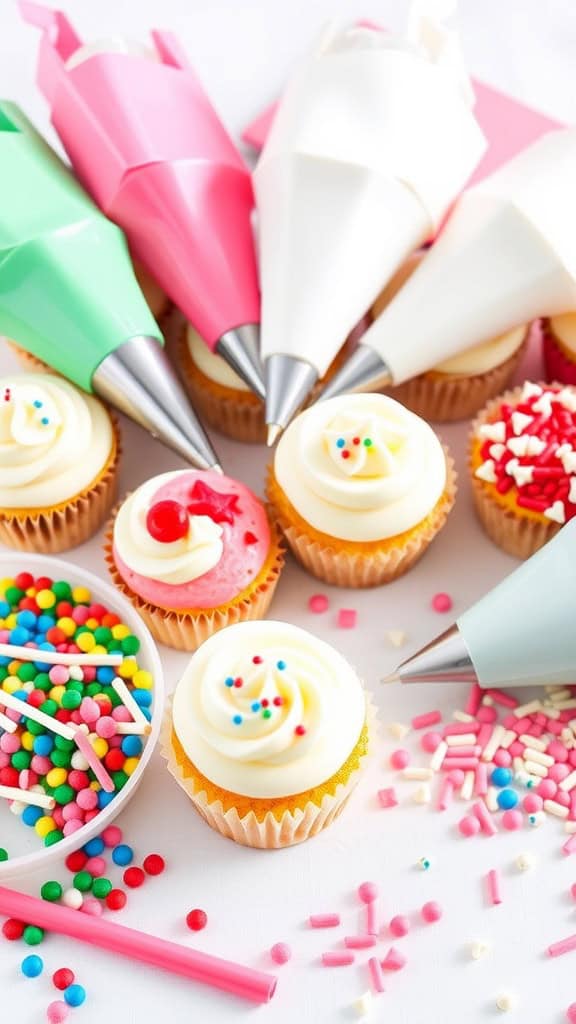 Cupcake decorating is a fun and interactive activity for any birthday picnic. The image showcases a delightful spread of cupcakes ready for decoration. Each cupcake features a swirl of creamy frosting, just waiting to be topped with sprinkles and other colorful treats. Various decorating tools and toppings are scattered around, including a squeeze bottle for precise icing and an array of vibrant sprinkles. This setup invites everyone to join in on the fun, whether they are seasoned bakers or just trying it for the first time. The cheerful presentation adds to the overall festive vibe of the birthday celebration.