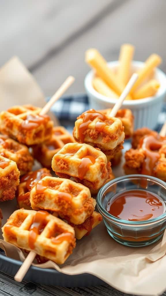 Begin by cooking the waffles according to package instructions. Once they’re golden and ready, cut them into bite-sized pieces. Next, fry the chicken tenders until they are crispy. Assemble the bites by placing a piece of chicken between two waffle squares on wooden sticks for easy handling.
