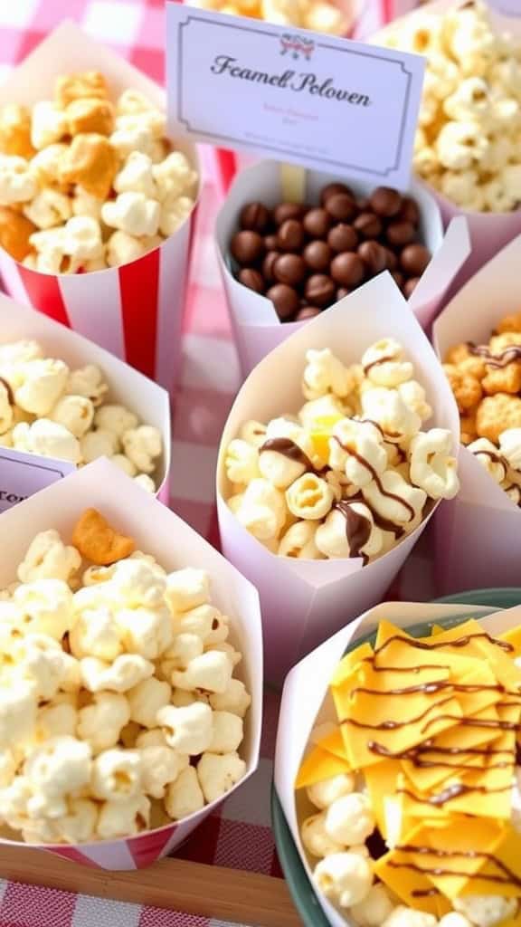 Start with classic buttery popcorn as your base. Then, offer creative flavors like cheese, caramel, and even chocolate drizzled options for a sweet twist. You can also include toppings like sprinkles, nuts, or candy pieces to elevate the experience. This not only caters to different taste preferences but also adds a personal touch for each guest.