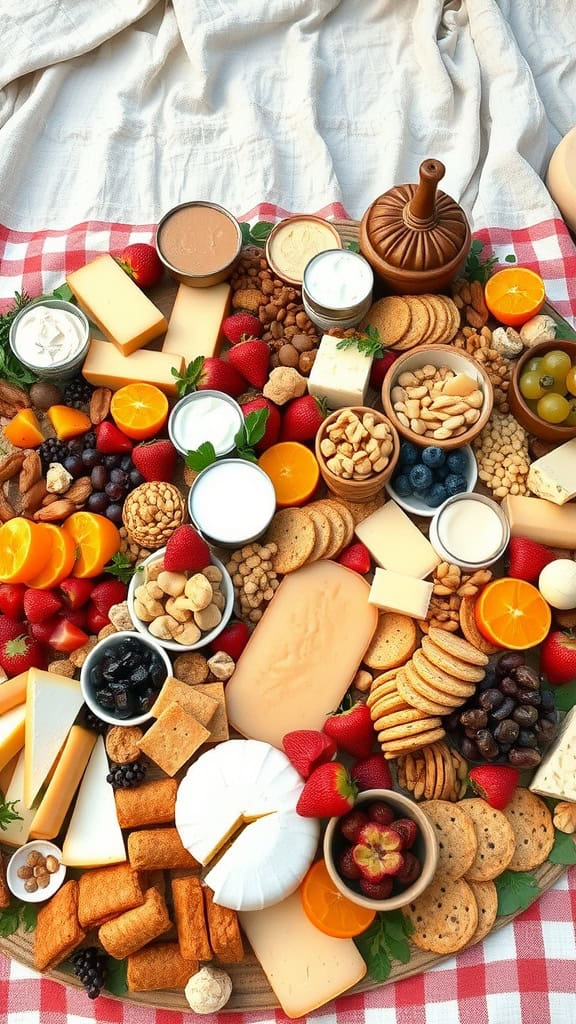This picnic spread features an array of cheeses, fresh fruits, and crunchy snacks. You’ll spot creamy cheeses alongside strawberries and blueberries, making the spread visually appealing. Nuts and assorted crackers fill the gaps, giving your guests plenty of options.