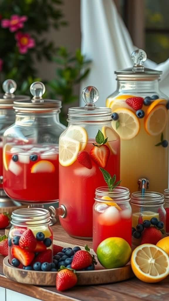 Set up a beautiful display with various jars of lemonade. You can use clear glass containers to show off the colorful fruits inside. Adding cute labels can help guests choose their favorite flavors. Don’t forget ice cubes to keep everything cool on a warm day!