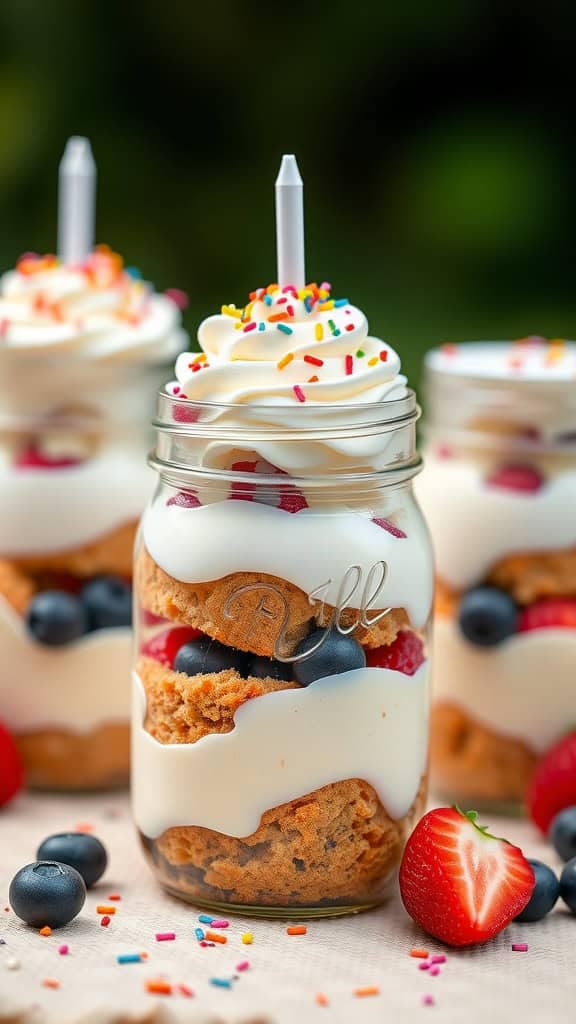 The image shows beautiful mason jars filled with layers of cake, whipped cream, and colorful sprinkles. Each jar has a birthday candle sticking out, adding a festive touch that everyone will love. The vibrant strawberries and blueberries peek through the layers, making the trifles not just tasty but visually appealing, too!