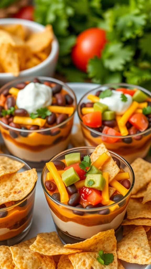 Each cup is filled with creamy layers of refried beans, guacamole, sour cream, and salsa, topped with colorful ingredients like shredded cheese, diced tomatoes, and fresh cilantro. The bright colors make the cups look appealing and inviting.