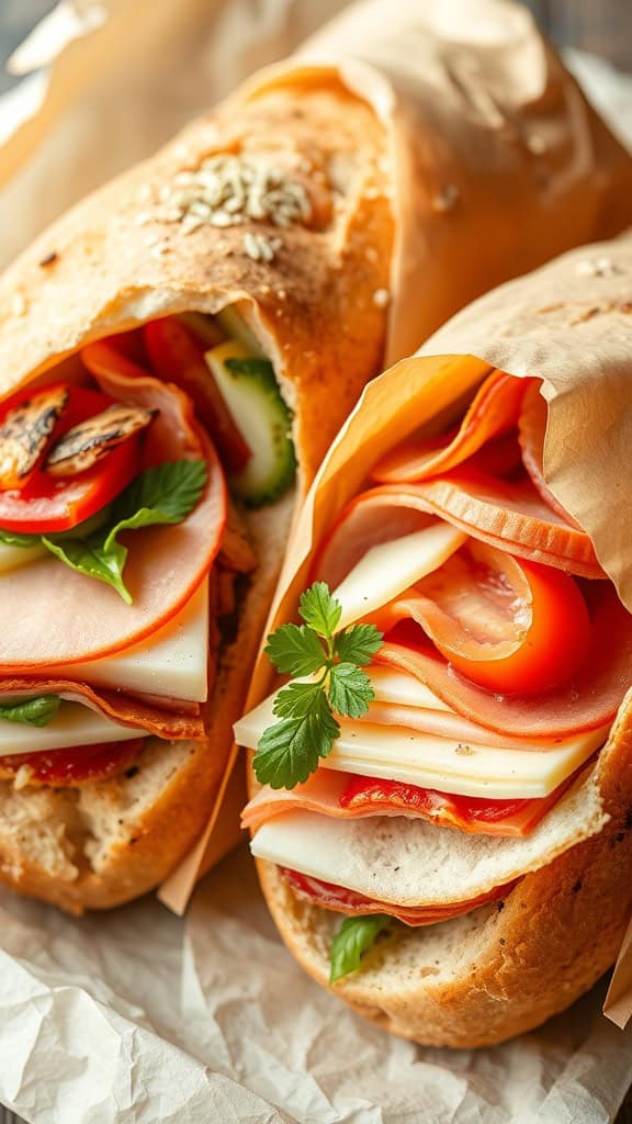 To make these tasty baguettes, start with a fresh baguette as your base. You can fill them with a mix of deli meats, cheeses, and crunchy veggies. Think slices of turkey or ham, creamy Swiss cheese, and crisp lettuce, along with juicy tomatoes and pickles. Don’t forget to add some herbs for an extra punch of flavor!