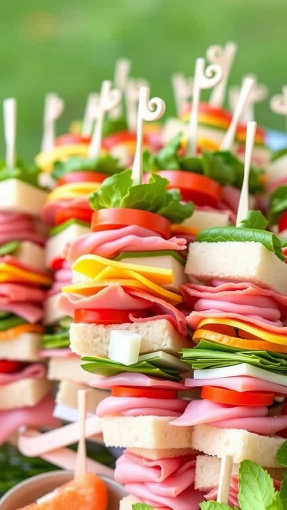 - Layer the Ingredients: On each skewer, alternate stacking the bread, deli meats, cheese, and veggies as you like.