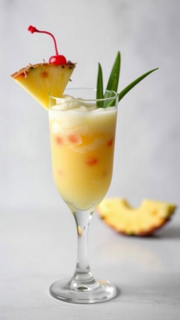 - Garnish each glass with a pineapple slice and a maraschino cherry on top.