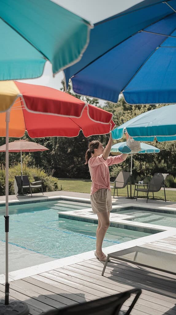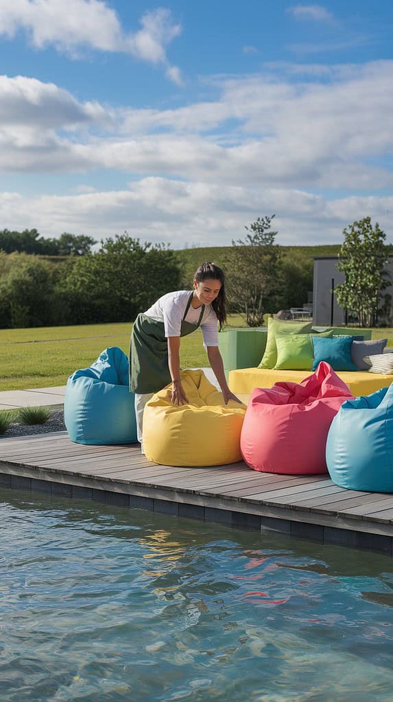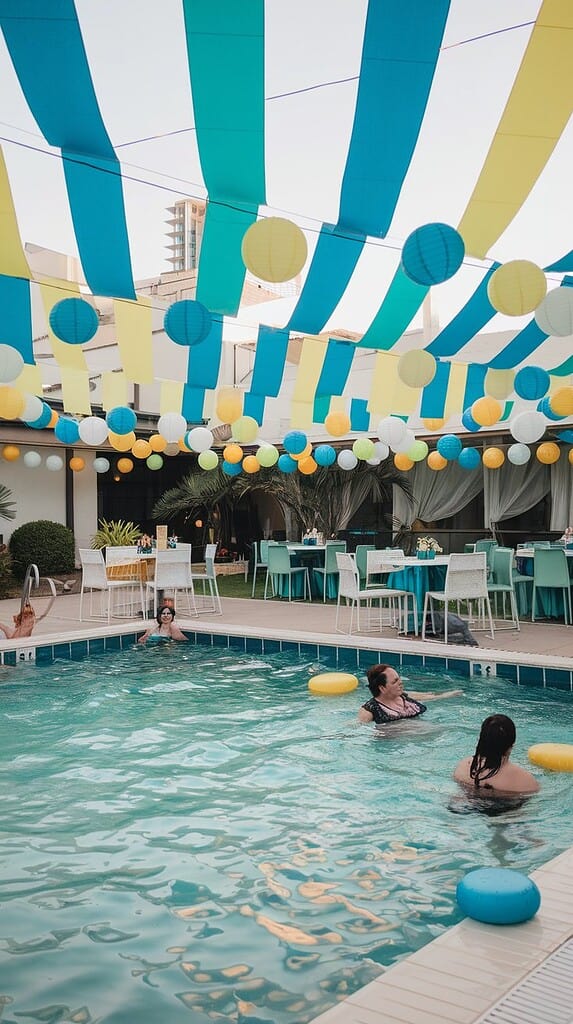 Hanging decorations add dimension to your space. String paper lanterns, fairy lights, or colorful pennant banners across the pool area. These look especially magical as daylight fades.
