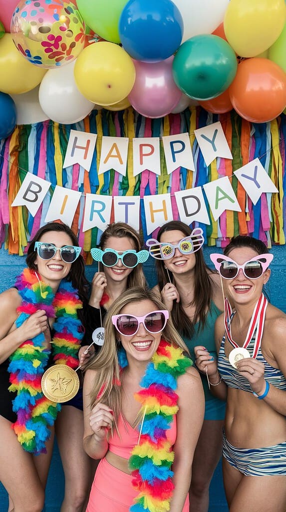 Create a simple poolside photo booth with a waterproof backdrop in summer colors. Hang it on a fence or between two poles. Add props like oversized sunglasses, inflatable flamingos, and funny swim caps.