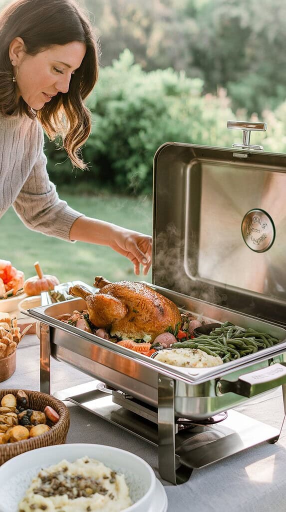 Consider investing in chafing dishes with Sterno fuel cans. These flameless heating sources burn for hours and keep food at the perfect serving temperature. They’re perfect for mashed potatoes and gravy!