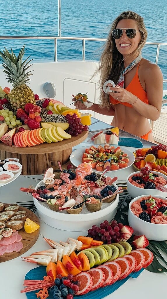 For non-alcoholic options, offer fruit-infused water in glass dispensers with slices of cucumber, pineapple, and mint. Freshly squeezed juices and smoothies are perfect for daytime sailing.